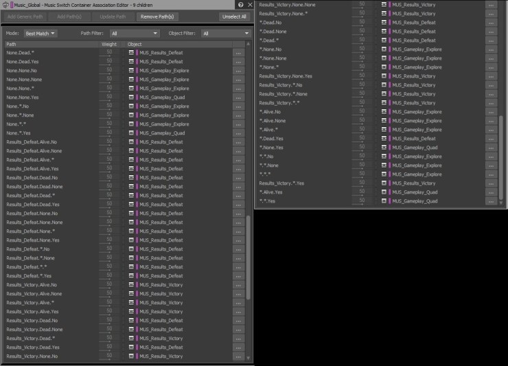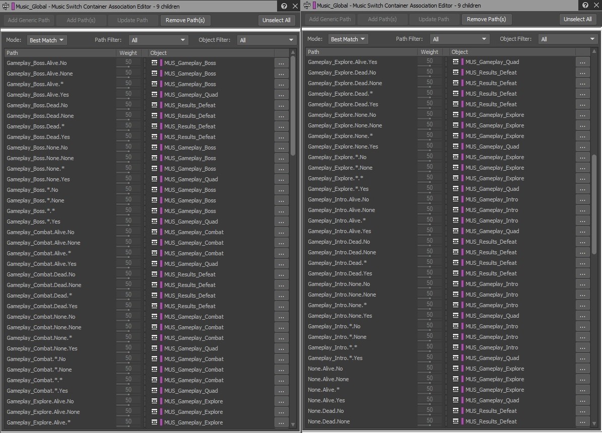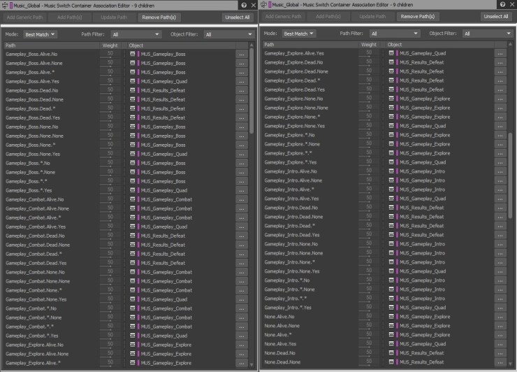 This is where we assigned Wwise switches and states to list out path variables of the parameters in each state or switch, so that we can tell Wwise which music track to play in which situation.